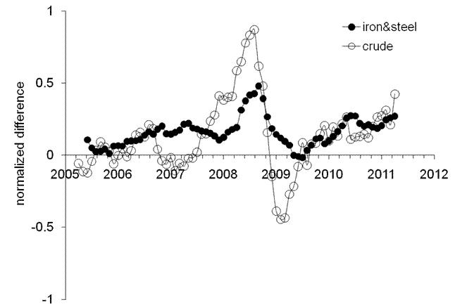 Figure 1 depicts the corresponding time histories of the normalized deviations from the PPI, including the most recent period since December 2010. Simple visual inspection reveals the following feature: the (normalized deviation from the PPI of the) index of iron and steel lags by approximately two months behind the (normalized) index of crude oil.