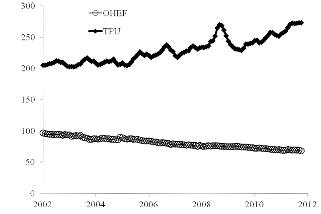 Here we present a brand new share price model for Avon Products (NYSE: AVP). In April 2011, this model also showed a higher level of reliability and described the price through March 2011. We intentionally skipped it to publish in this blog because the predicted price showed just a small fall. The model was based on our concept linking share pieces and consumer price indices. The share price model for Avon Products was defined by the index of other household equipment and furnishing (OHEF) and that of public transportations (TPU). Figure 1 illustrates the evolution of these indices. In the April model, the former CPI component led the share price by 8 months and the latter one led by 5 months.
