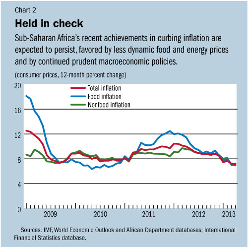 Recent achievements in curbing inflation—projected to average 6.9 percent in 2013—are expected to persist, favored by less dynamic food and energy prices and by the maintenance of prudent macroeconomic policies (see Chart 2). Nevertheless, some countries that continue to experience a rapid increase in prices will need to continue their efforts to keep inflation under control, the outlook says.